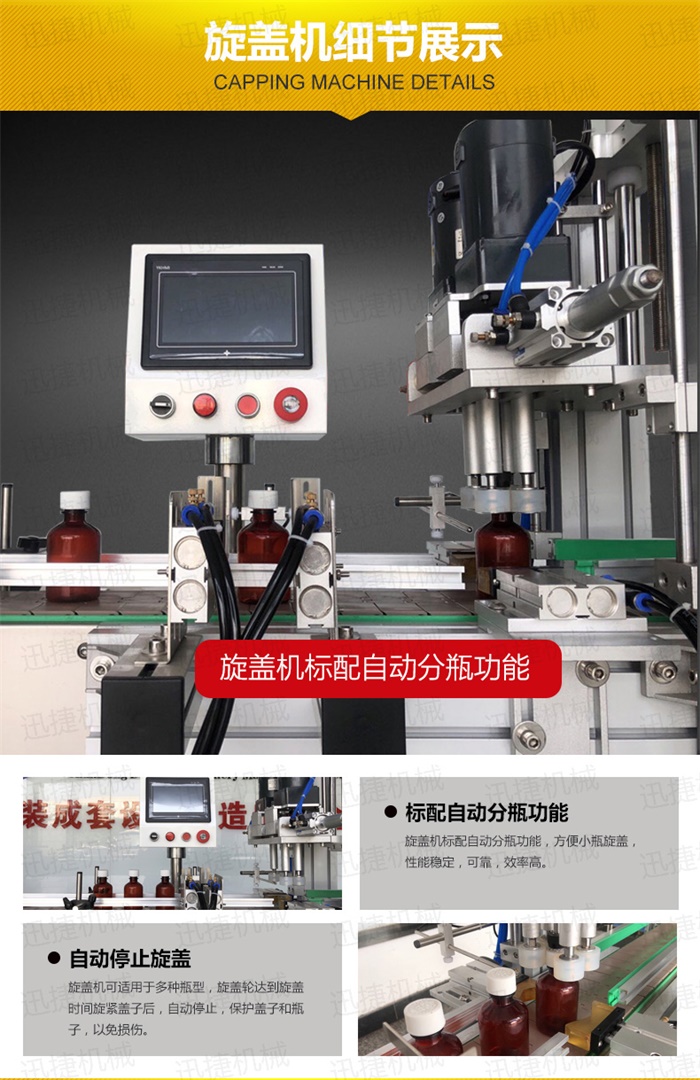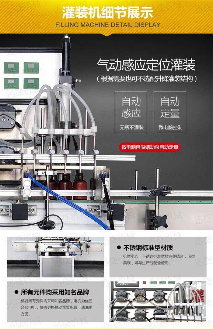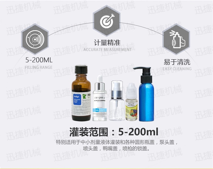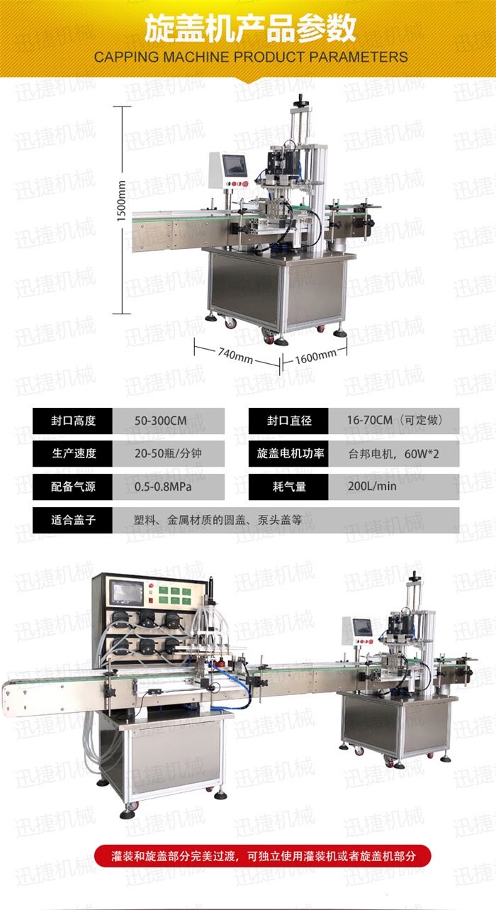 特 點(diǎn):定量灌裝,和瓶蓋旋蓋,在一臺機(jī)器上完成。具有占地空間小,自動化程度高特點(diǎn)
