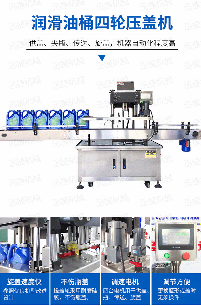 全自動旋蓋機是參照國機型改進設計、旋蓋速度快,合格率高、操作方便??蛇m用于食品、制藥、日化、農(nóng)藥、化妝品等行業(yè)的不同瓶形的旋蓋。四臺調(diào)速電機分別用于供蓋、夾瓶、傳送、旋蓋,機器自動化程度高,穩(wěn)定性好,調(diào)節(jié)方便,更換瓶形或蓋時無須備件,只需作調(diào)整即可完成(如配上蓋機,可進行自動上蓋)可以根據(jù)實際需要選配。