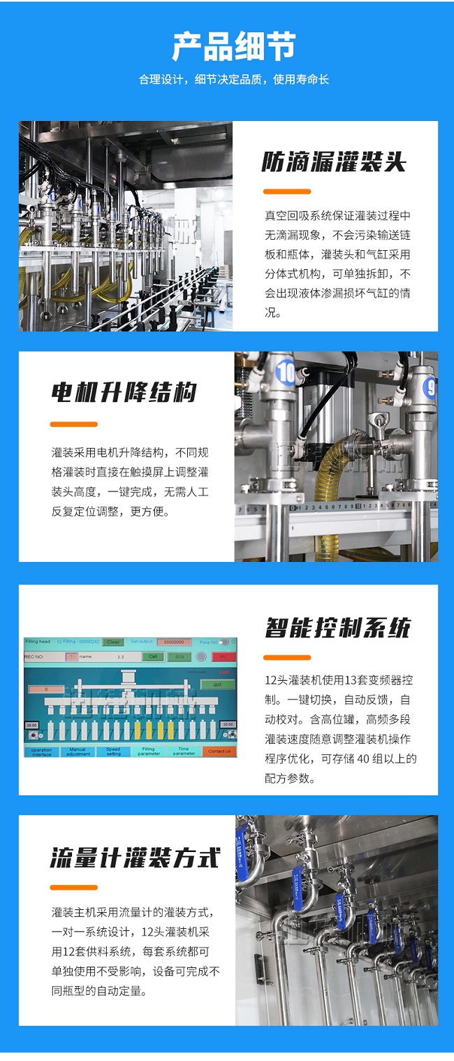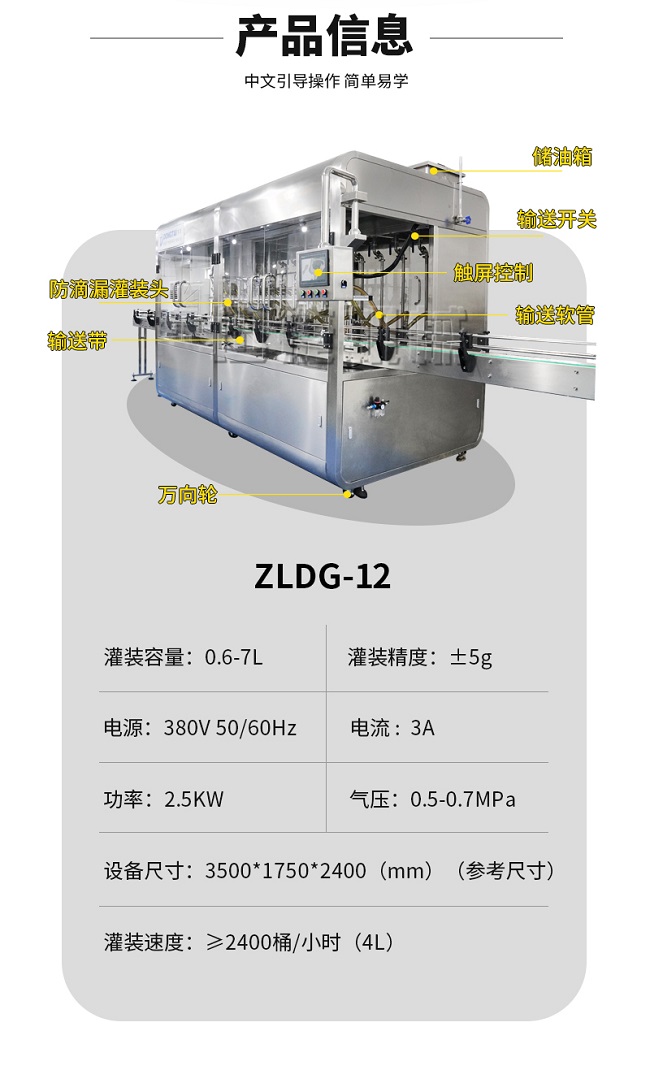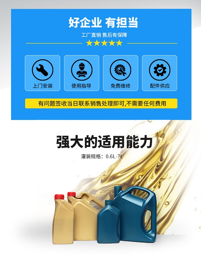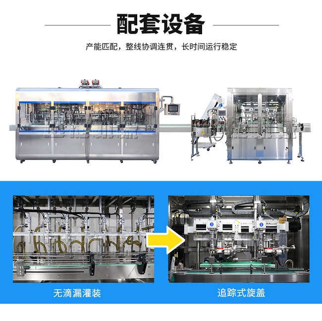 該灌裝機可以配置 高速旋蓋機 油桶貼標機 油瓶噴碼機 油壺自動自動裝箱碼垛機。組成油脂灌裝包裝流水線。高效、節(jié)能、自動化的設備。