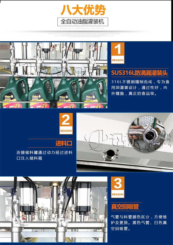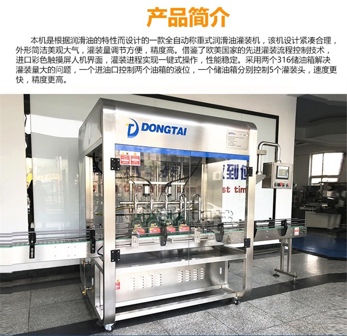 本機(jī)是根據(jù)潤滑油的特性而設(shè)計(jì)的一款全自動(dòng)稱重式潤滑油灌裝機(jī),該機(jī)設(shè)計(jì)緊湊合理,外形簡(jiǎn)介美觀大氣,灌裝量調(diào)節(jié)方便,精度高。借鑒了歐美國家的灌裝流程控制技術(shù),彩色觸摸屏人機(jī)界面,灌裝進(jìn)程實(shí)現(xiàn)一鍵操作,性能穩(wěn)定。采用兩個(gè)316儲(chǔ)油罐解決灌裝量大的問題,一個(gè)進(jìn)油口控制兩個(gè)油箱的液位,一個(gè)儲(chǔ)油箱分別控制5個(gè)灌裝頭,速度更快,精度更高。
