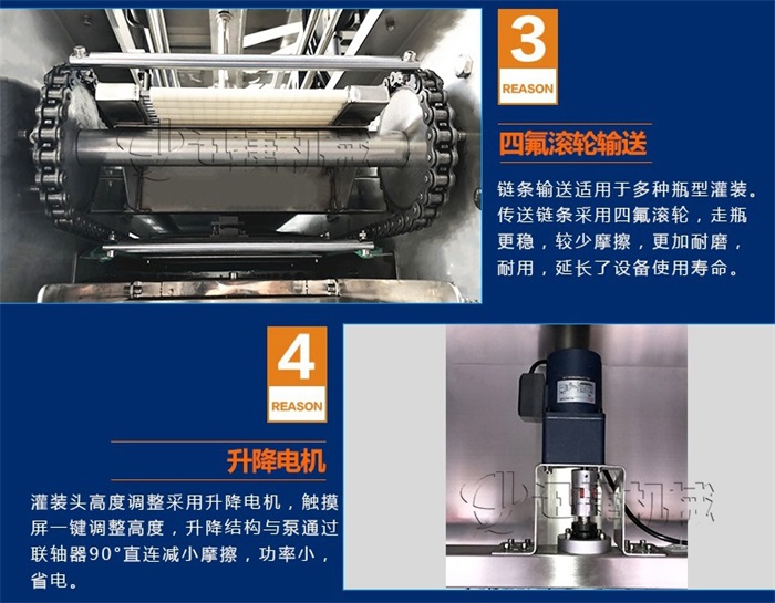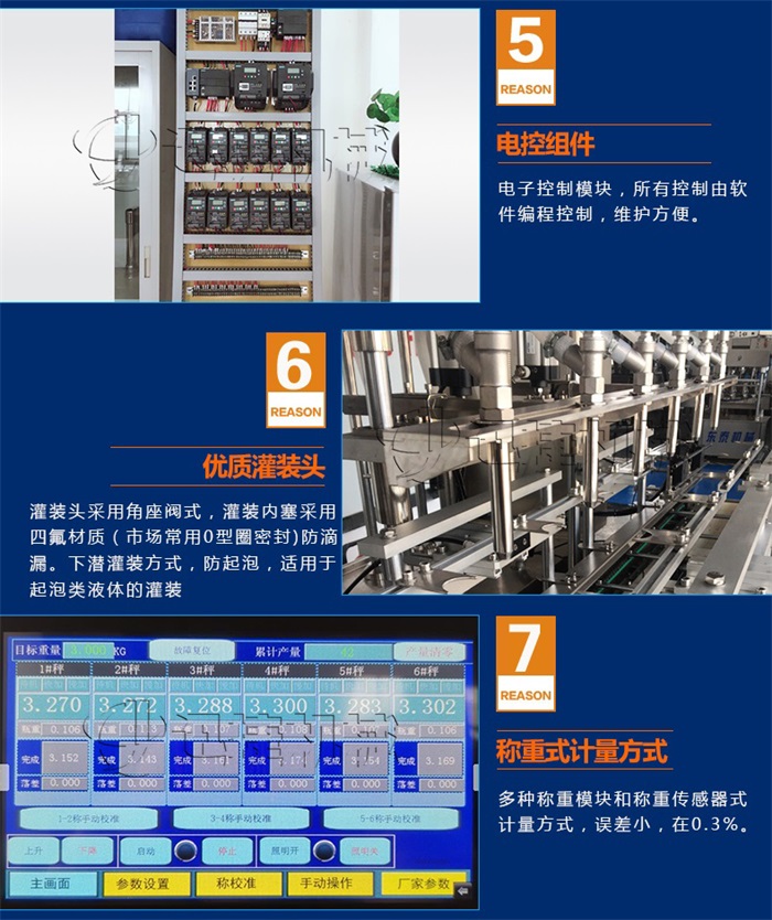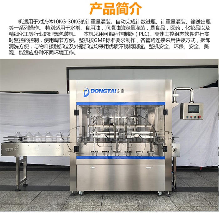 機適用于對流體5kg-30kg的計重量灌裝。自動完成計數(shù)進瓶、計重量灌裝、輸送出瓶等一系列操作。 特別適用于水劑、食用油,潤滑油的定量灌裝,是食品,醫(yī)藥,化妝品以及精細化工等行業(yè)的包裝機。本機采用可編程控制器(PLC)、高速工控組態(tài)軟件進行實時監(jiān)控的控制,使用調(diào)節(jié)方便。整機按GMP標(biāo)準要求制作,各管路連接采用快裝方式,拆卸清洗方便,與物料接觸部位及外露部位均采用優(yōu)質(zhì)不銹鋼制造。整機安全、環(huán)保、安全、美觀、能適應(yīng)各種不同環(huán)境工作。