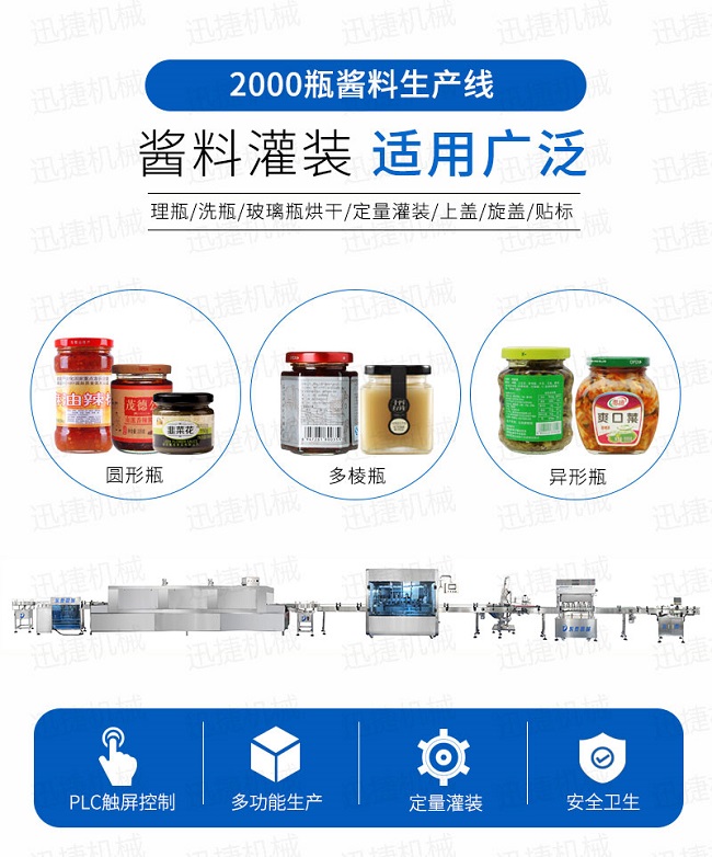 牛肉顆粒醬各種各樣的包裝方式在我們的生活中并不少見(jiàn),隨著牛肉顆粒醬灌裝豐富化時(shí)代的到來(lái),那么針對(duì)這么多包裝需求只要選擇這款全自動(dòng)牛肉顆粒醬灌裝機(jī)設(shè)備就可以輕松的去實(shí)現(xiàn)多樣化的包裝方法,具備無(wú)滴漏灌裝;管道采用快裝式鏈接,完全符合衛(wèi)生要求,拆洗維護(hù)方便;全自動(dòng)牛肉顆粒醬灌裝機(jī)設(shè)備還保障了瓶口干凈衛(wèi)生,輸送帶干凈衛(wèi)生,符合GMP標(biāo)準(zhǔn)有著操作調(diào)節(jié)便利,無(wú)瓶不灌裝,自動(dòng)檢測(cè),計(jì)數(shù)等一些類比較出色的優(yōu)勢(shì)特點(diǎn),迅捷機(jī)械可根據(jù)客戶需求配理瓶機(jī)、旋蓋機(jī),貼標(biāo)機(jī),打碼機(jī)等設(shè)備來(lái)實(shí)現(xiàn)自身企業(yè)的實(shí)際生產(chǎn)需求。