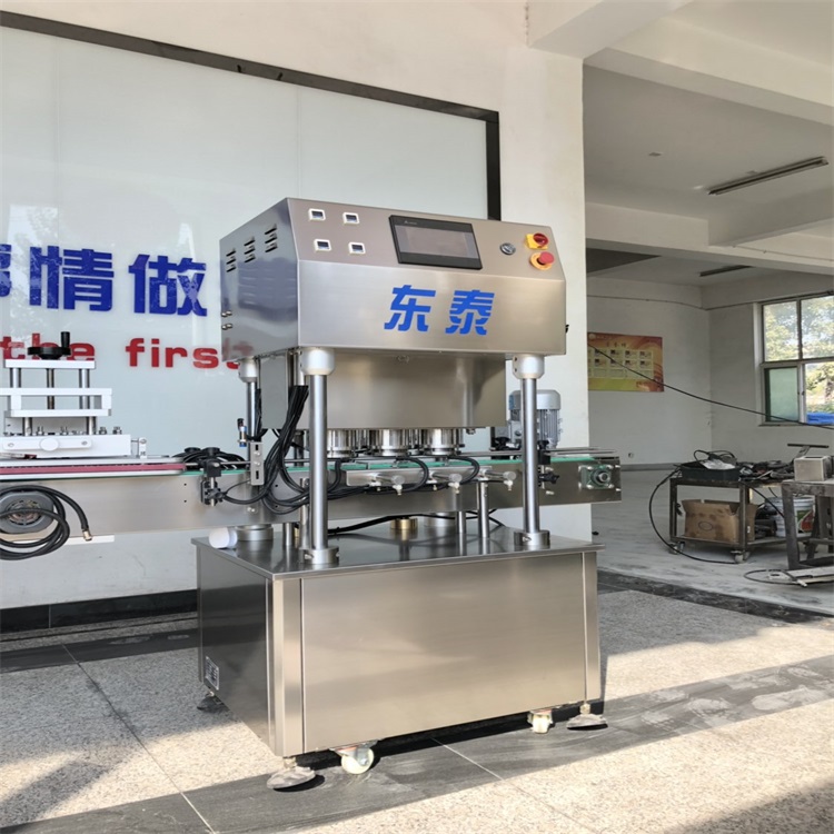 開動(dòng)設(shè)備,把托架降到低點(diǎn),然后把包裝瓶放置到托架上,松開螺母讓托架上升,調(diào)整好瓶蓋和壓蓋頭的距離即可。